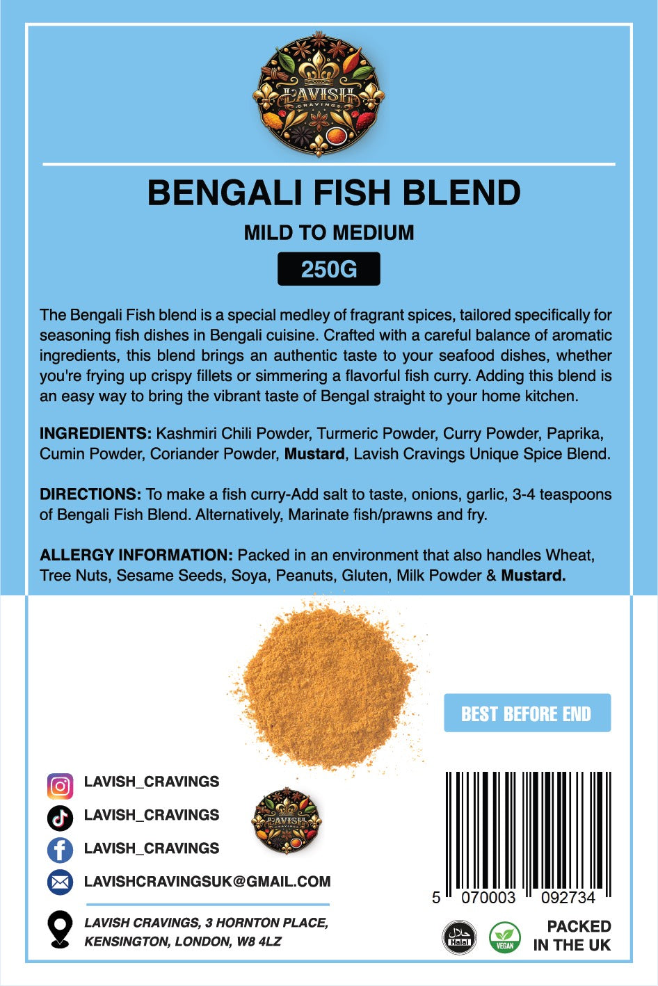 Kashmiri Chilli Powder, Turmeric Powder, Curry Powder, Paprika, Cumin Powder, Coriander Powder, Mustard, Lavish Cravings Unique. Blend