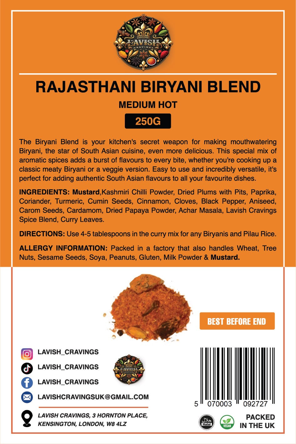 Kashmiri Chilli Powder, Dried Plums with Pits, Paprika, Coriander, Turmeric, Cumin Seeds, Cinnamon, Cloves, Black Pepper, Aniseed, Carom Seeds, Cardamom, Dried Papaya Powder, Achar Masala, Lavish Cravings Spice Blend, Curry Leaves.
